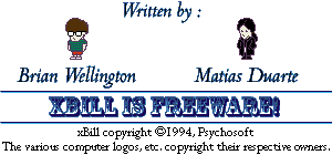 XBill was mostly written during the summer of 1994 by Brian Wellington and Matias Duarte, and has gone through several revisions since. The current version is 2.1. New ideas are appreciated, and if they sound interesting enough, may be implemented. Especially if those new ideas include graphics.